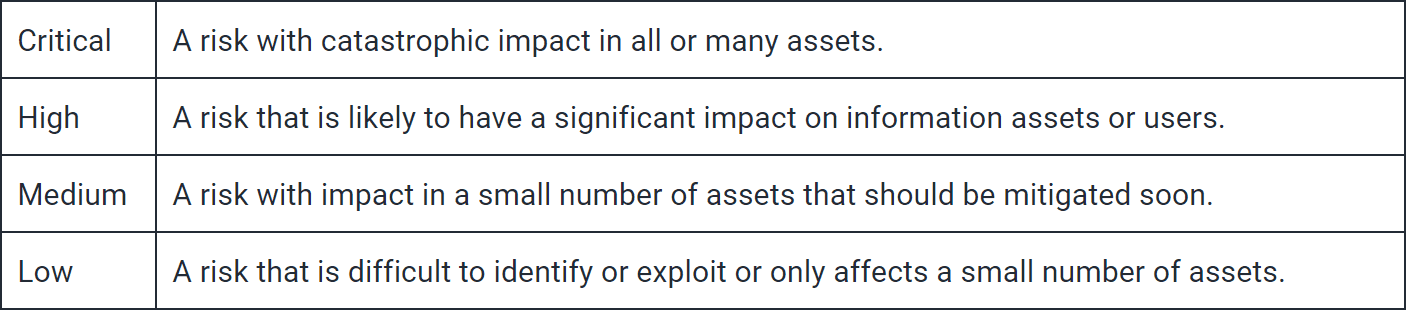 Low: A risk that is difficult to identify or exploit or only affects a small number of assets.